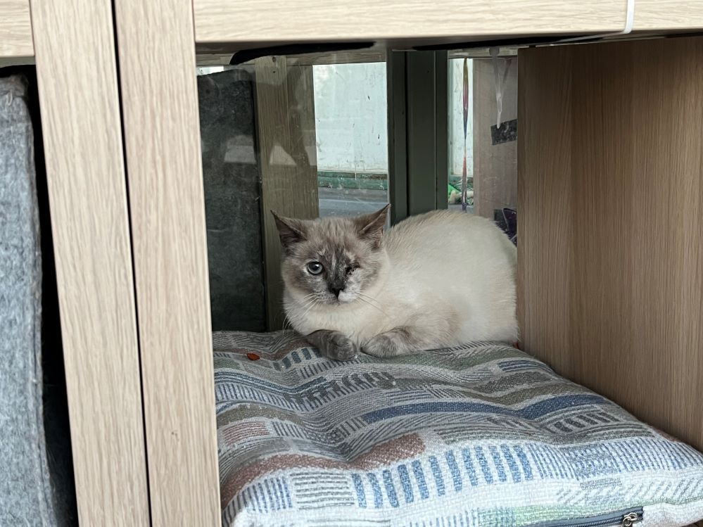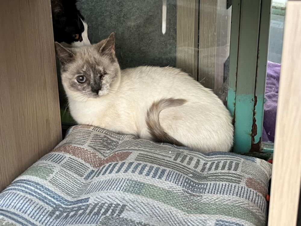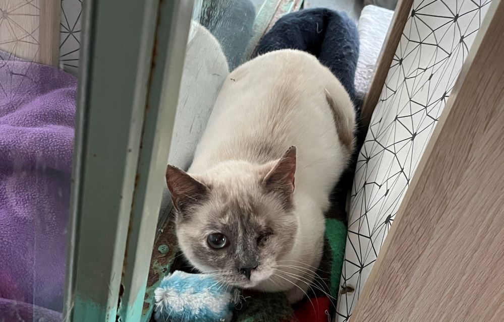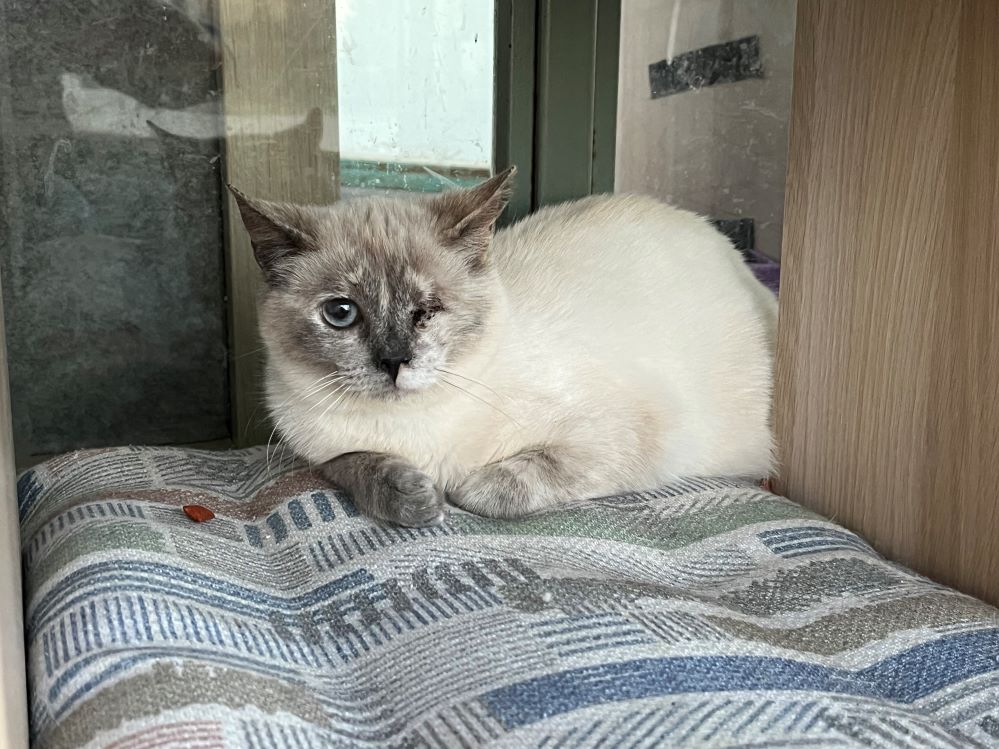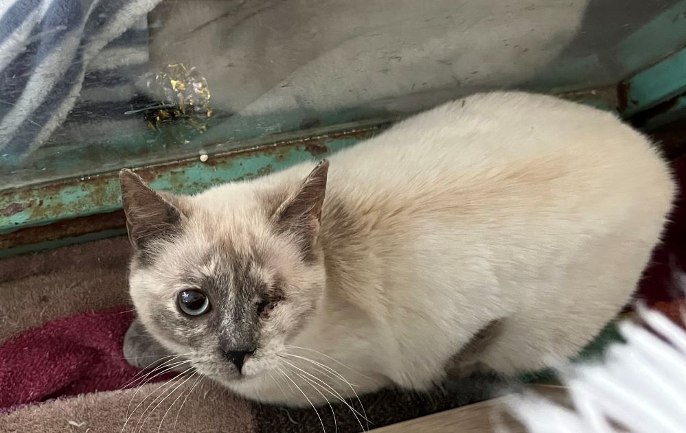 Historial de adopción:   Dulcinea llegó con un ojo mal, esto le producía mucho dolor.   Ha estado sufriendo hasta que hemos podido quitárselo.   Así estaba de asustada la pobre, cuando nos ve se esconde, pero parece que poco a poco se le va pasando.   Ahora que ya no tiene dolor empezará a relajarse y podremos disfrutar de ella, y ella de nosotros.