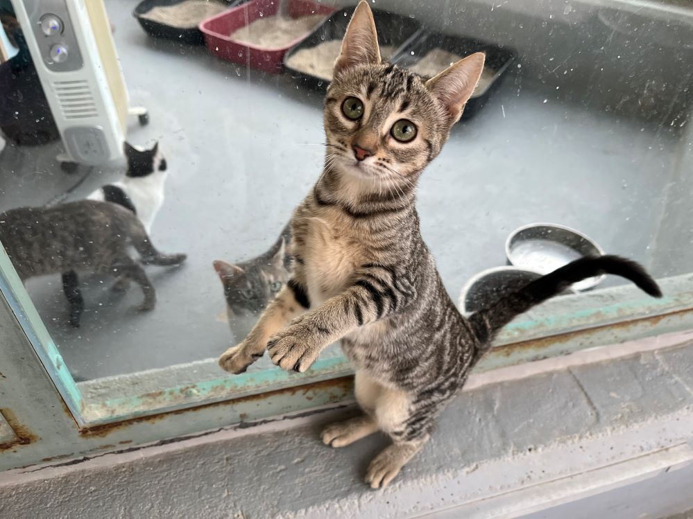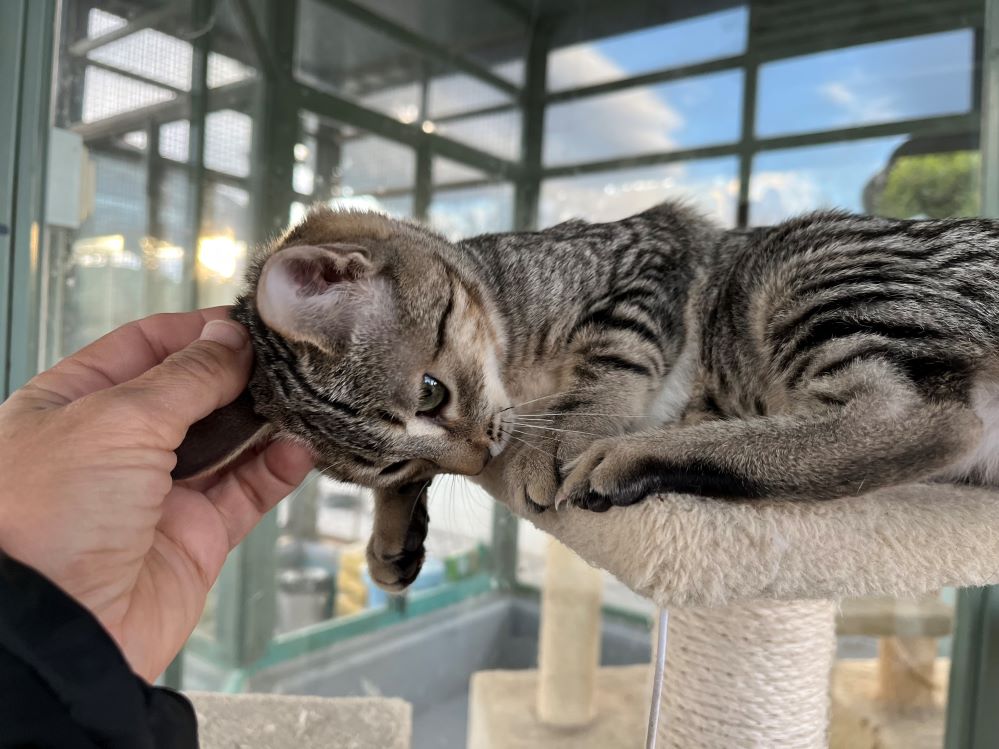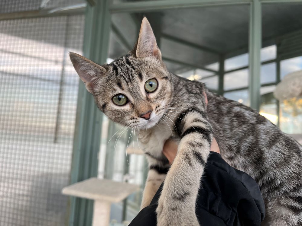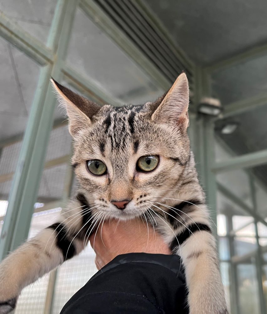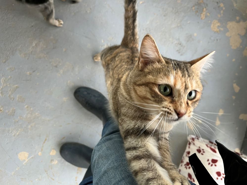Mairi es riquísima, se te sube por la pierna en cuanto te descuidas para que le hagas caso. Tiene una malformación de nacimiento en el esternón llamada Pectus carinatum. En principio no le impide hacer vida normal pero hay que esperar a que finalice su desarrollo para ver como evoluciona. La familia que la adopte tiene que ser consciente de que tendrá que estar un poco más pendiente de ella. Ahora corre, salta y juega por la gatera como una locuela. Es una gata súper sociable, cariñosa y ronroneadora.