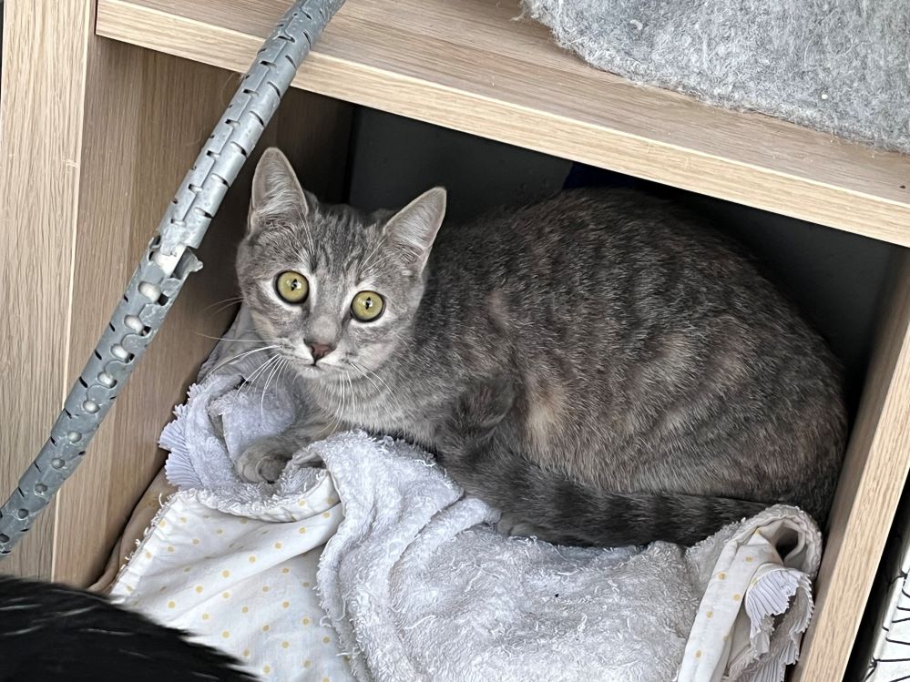 | Historial de adopción: Zahara es una gatita preciosa que tiene mucho miedo a la gente. De momento solo sale si hay «chuches» de por medio. Cuando vienen visitas a conocer a los gatitos, ella se esconde y pasa desapercibida.